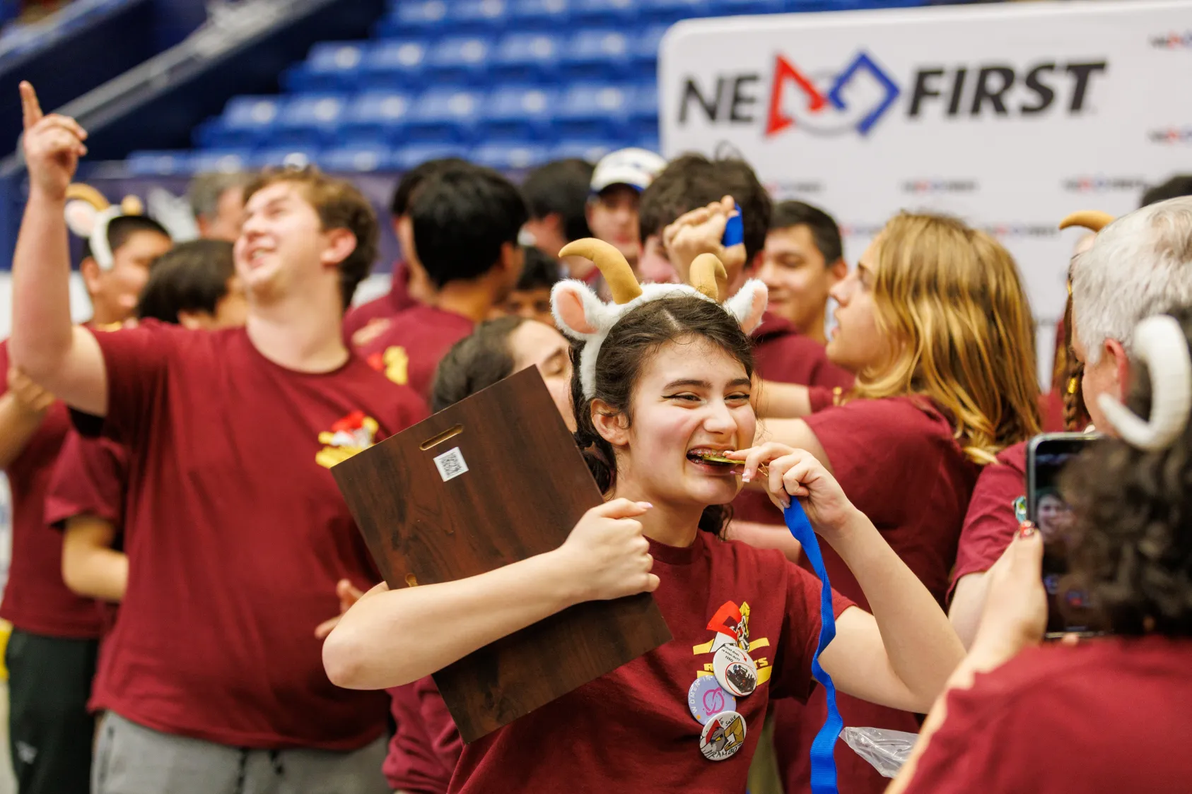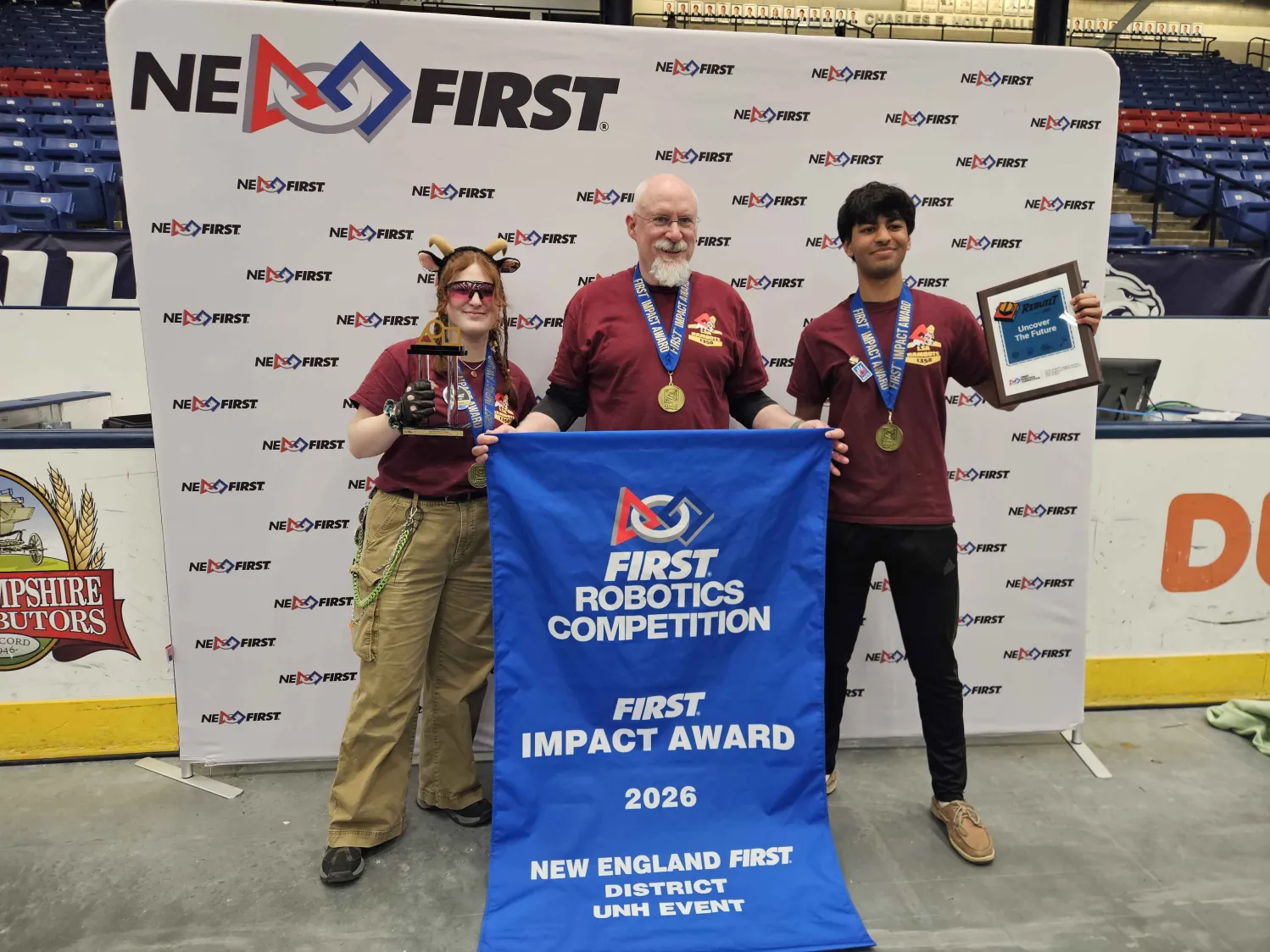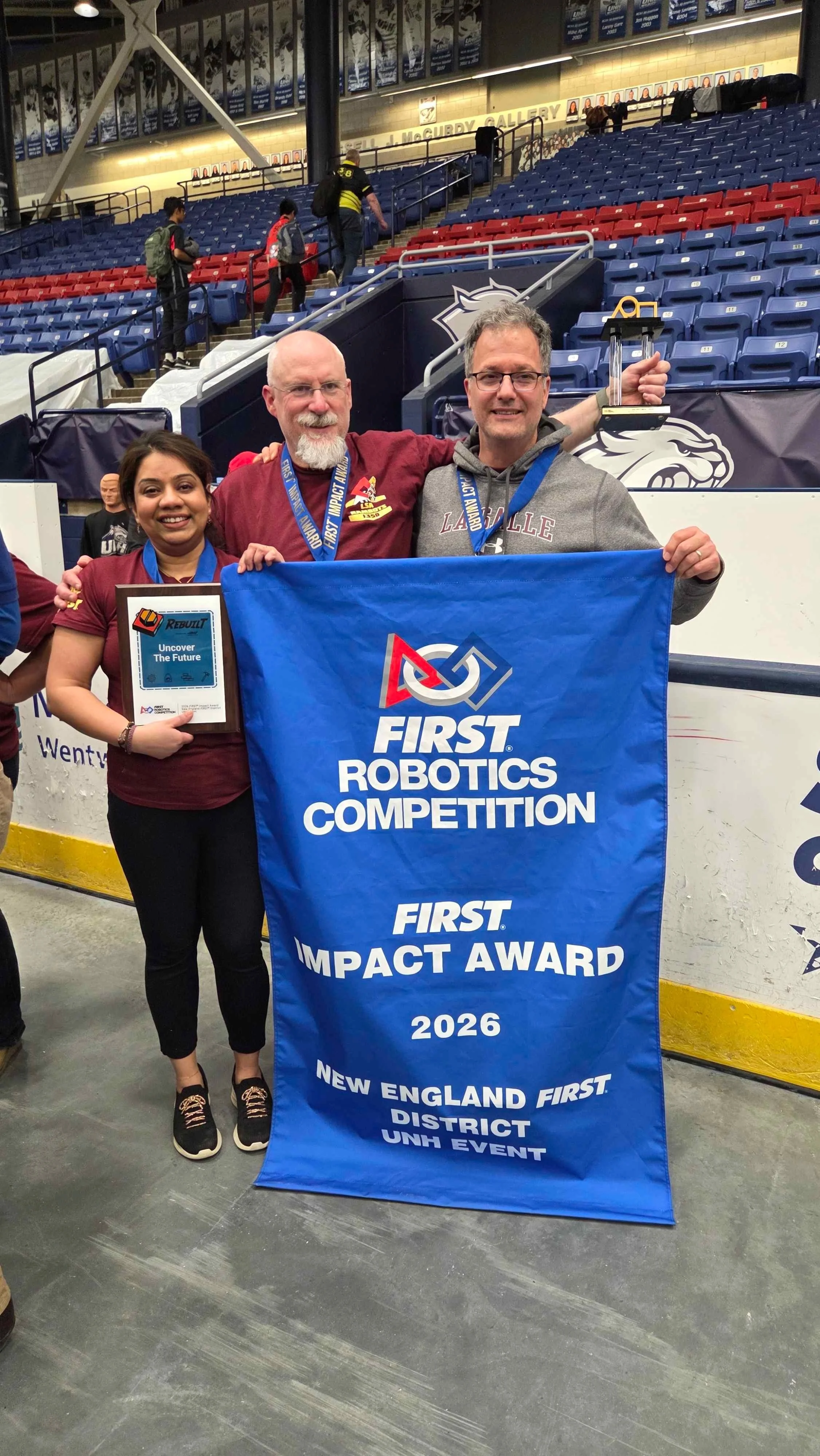 After returning from a long and hard fought competition at the UNH Whittemore Center, we not only made it to the playoffs, but won the most prestigious award offered at FIRST, the Impact Award! Thanks to our Outreach Leader, Keira, with other members of the team chipping in to volunteer for events that Keira hosted, we are able to advance as a team to the District Competition held in The Big E in Springfield Massachusetts!